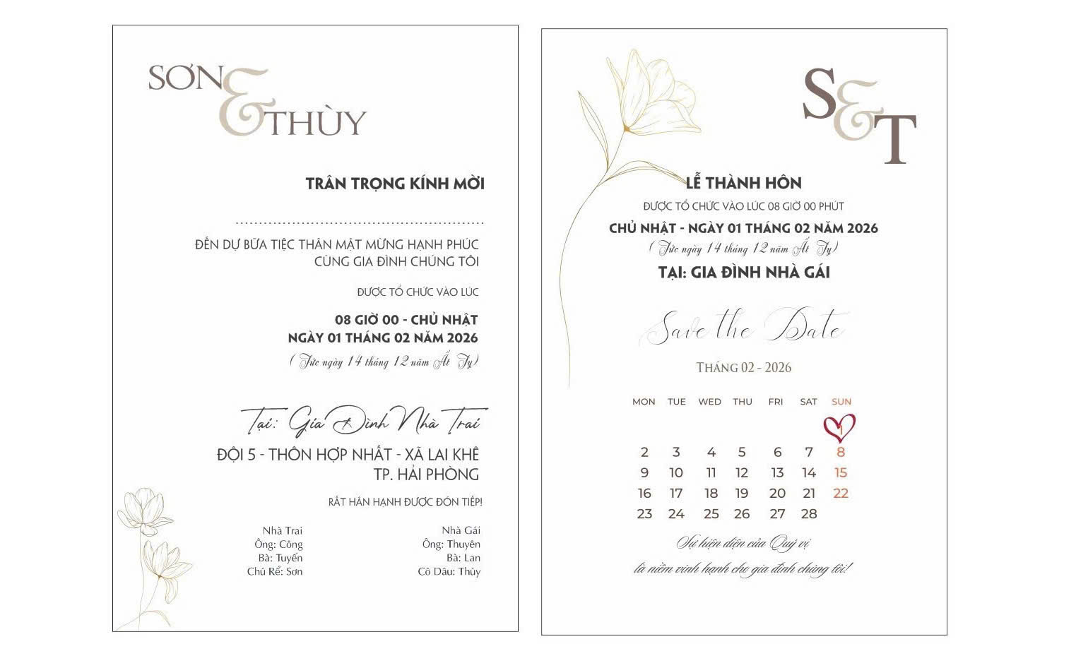 Giữa muôn vàn người trên thế giới, chúng tôi đã chọn nắm tay nhau đi hết chặng đường phía trước. Hôn lễ là cột mốc thiêng liêng, nơi tình yêu được gọi tên bằng hai chữ “gia đình”. Sự hiện diện của quý vị là niềm vinh hạnh và hạnh phúc lớn lao đối với chúng tôi.